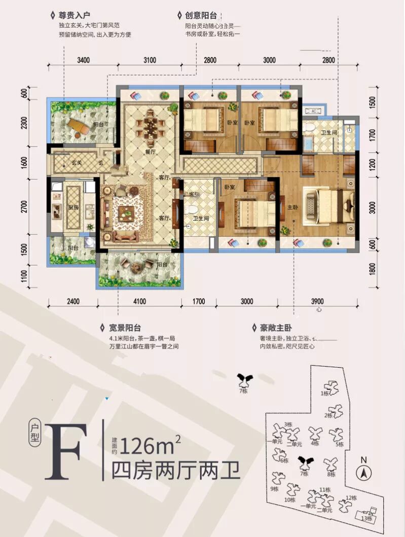 126㎡四房两厅两卫:对称分布于7栋端头位,每层两户。南北通透双阳台,户型较方正,客餐厅一体4.1米开间,南向景观阳台;厨房位于入户处带生活阳台,四个卧室中两个朝南,面积分布较均匀,主卧宽敞舒适带衣帽间和独立卫生间;入户处套内阳台可作为入户花园或多功能房间使用。