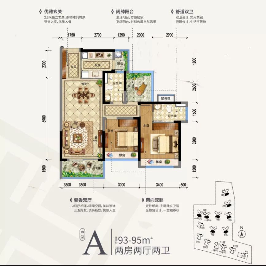 93-95㎡两房两厅两卫:对称分布于1/2/3/4/5/7/8栋中间位,每层两户。紧凑小三房,客餐厅3.6米开间,南向景观阳台,长2.3米入户玄关预留摆放鞋柜空间,厨房带有生活阳台;主次卧均为南向带有飘窗,主卧3.4米开间带有独立卫生间。北向套内阳台面积较小,可改造多功能房间使用。