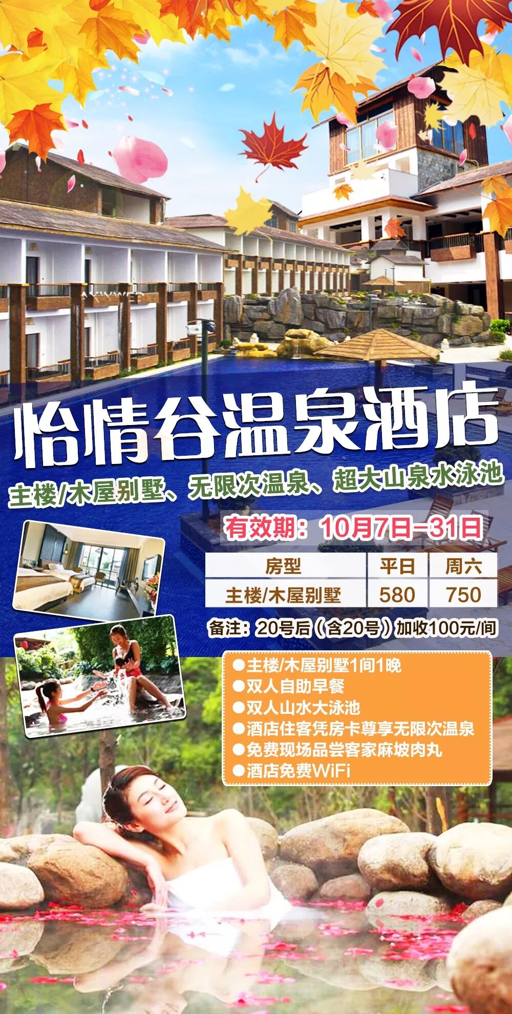 1.主楼/木屋别墅1间1晚2、双人自助早餐3.双人山水大泳池4.酒店住客凭房卡尊享无限次温泉5、免费现场品尝客家麻坡肉丸6、酒店免费WiFi