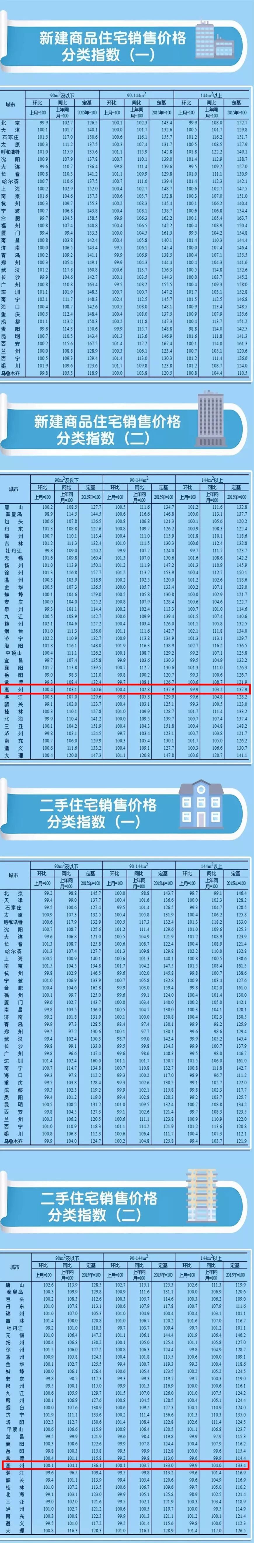 从具体城市表现来看,南宁、洛阳的新建商品住宅销售价格环比涨幅居前(南宁新建商品住宅销售价格环比上涨2.1%, 洛阳上涨2.0%),银川、西宁、昆明、呼和浩特的环比涨幅在1%以上。惠州环比上涨0.2%,基本维持稳定。