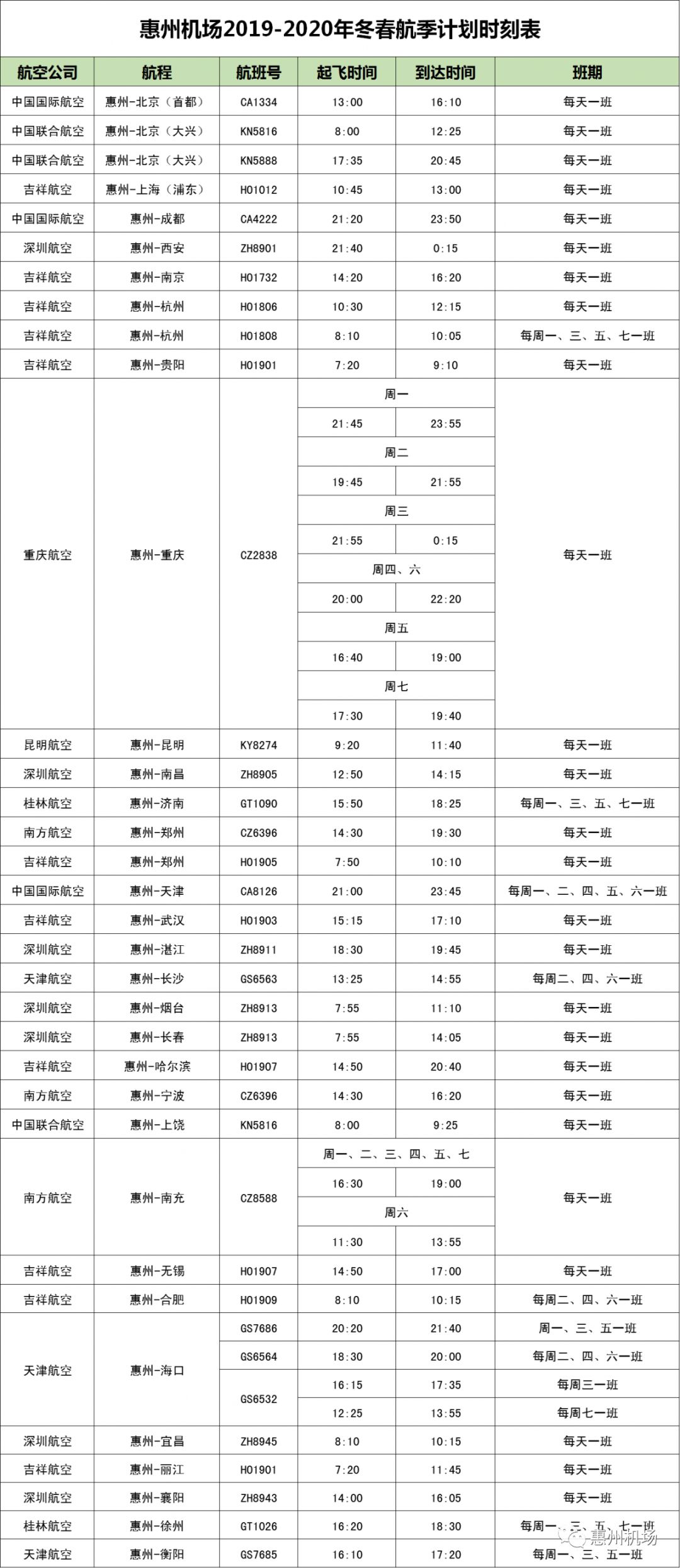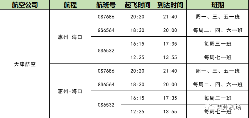 航班时刻及班期见下表: