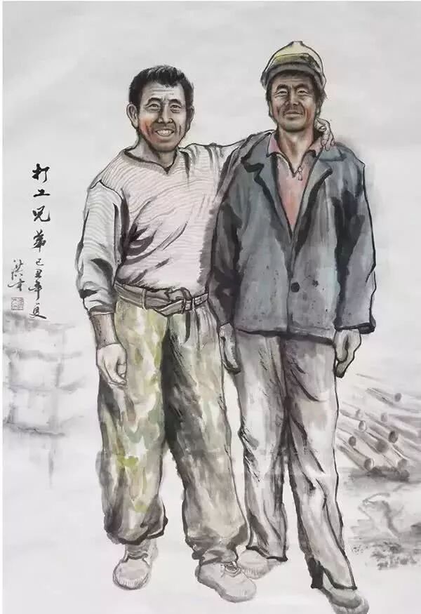 性格开朗的盖洪才,在你面前总是谈笑风生,他缓缓地在桌案上展开一幅画卷,映入眼帘的是两位衣着朴素、脸上布满沧桑感的农民兄弟,令人深深震撼。画面中两个农民兄弟脸上还未曾擦去的汗渍清晰可见,高兴地搭着肩膀站在一起,其乐融融。这就是盖洪才创作的《打工兄弟》,这幅画曾在第十六届中国广告业书画艺术大赛中喜获优秀奖。从书画中,能够感受到他们身上所展现出来的那种乐观、积极向上的态度。
