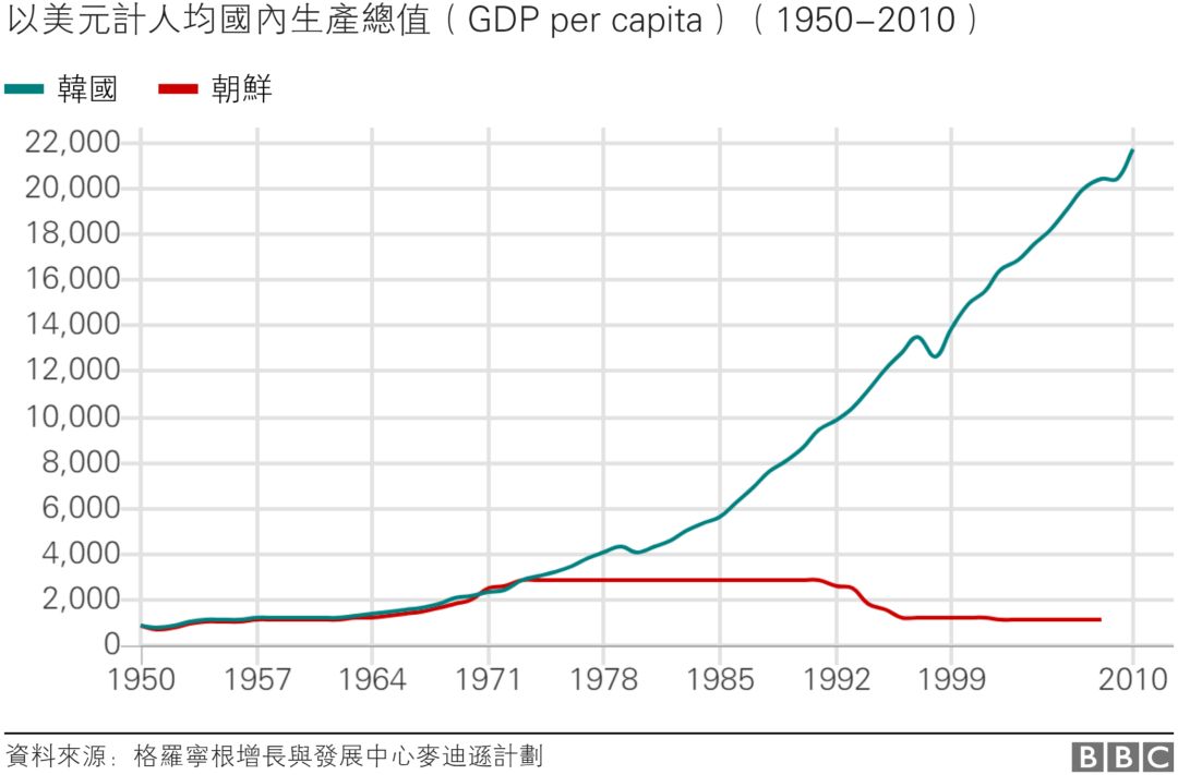 朝鲜的人均GDP曾经与韩国旗鼓相当,但自1973年开始就被远远抛下。