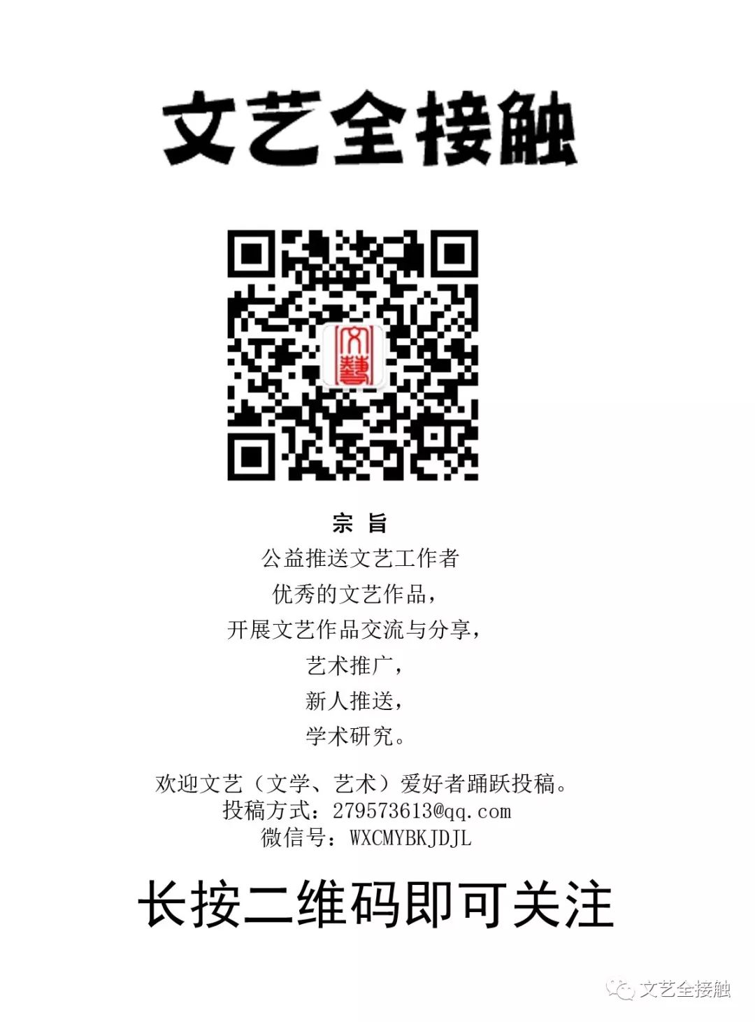 公众号“文艺全接触”是公益、无偿为广大文艺工作者服务,给大家提供一个展示自我,把自己的作品给大家分享、交流学习的平台。每天争取推出1—2位艺术家的作品,欢迎大家踊跃投稿参与。