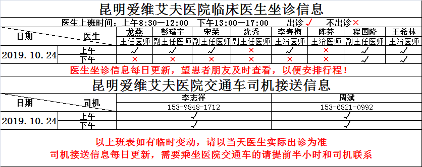 昆明爱维艾夫医院10月24日临床医生出诊一览