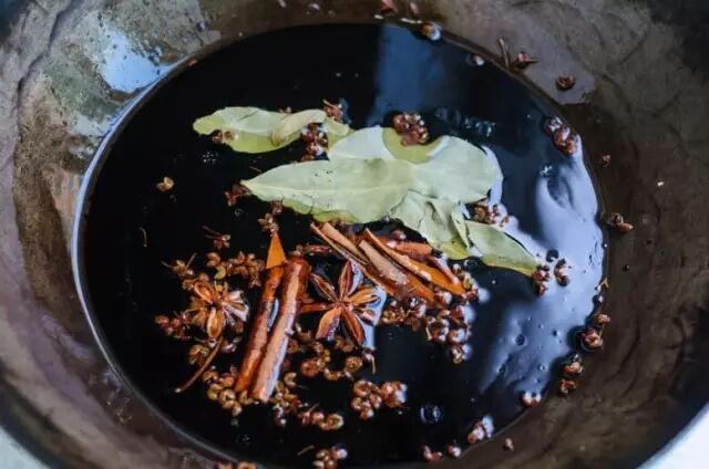 倒进酱油,放入八角、香叶、桂皮大火烧开后关火。
