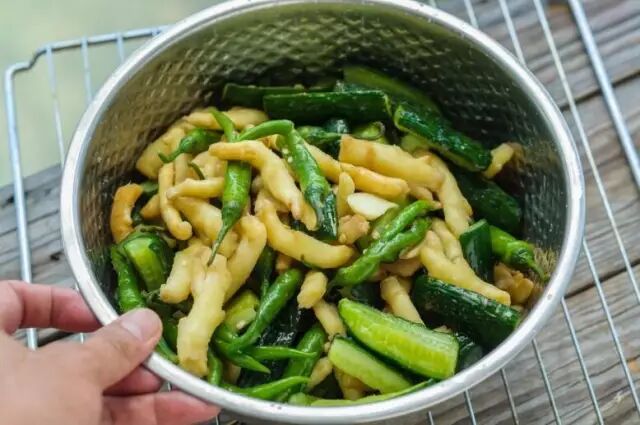 把腌渍好的黄瓜、姜芽、尖椒混合后滗出水分拌匀。