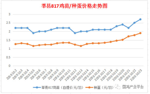 10.23日莘县817鸡苗(混合)报价自提2.70元/羽。(鸡苗创新高,较昨日上涨0.2元)昨日种蛋1.89-1.91元/枚。(种蛋价格上涨,再创史上高点,种蛋报价为保80%出壳率)