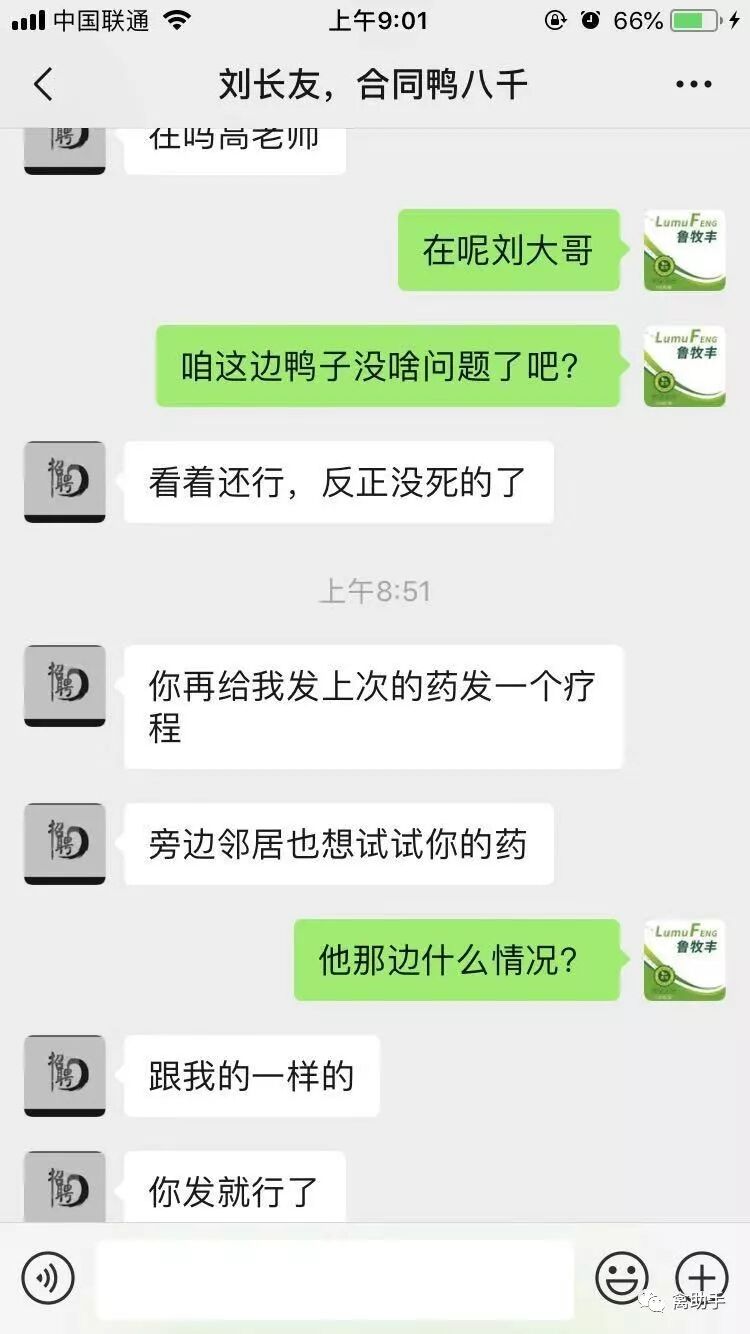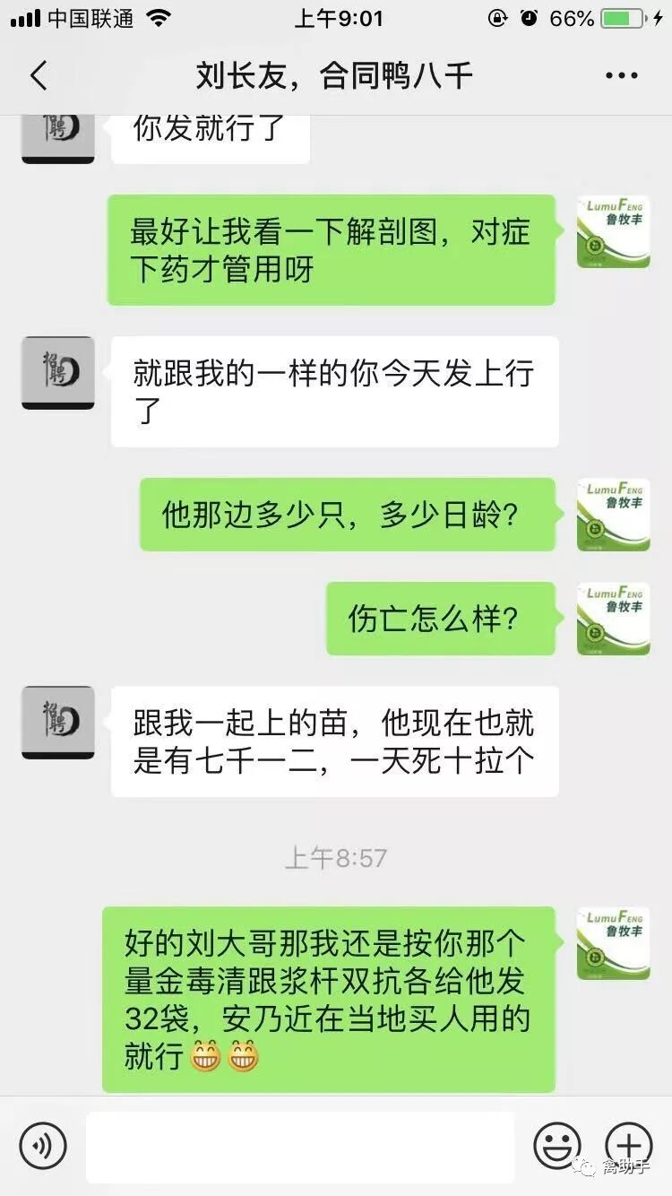用药三天后刘大哥打电话过来让我再给他发一个疗程的药过去,隔壁邻居家的跟他同一批鸭苗也出现了同样的情况,邻居看他的基本上没问题了也想用一个疗程的金毒清跟浆杆双抗。