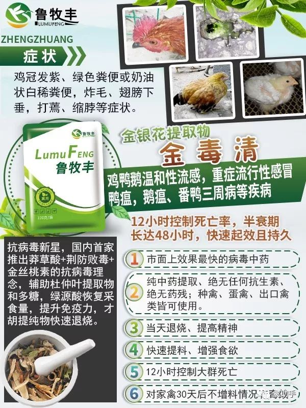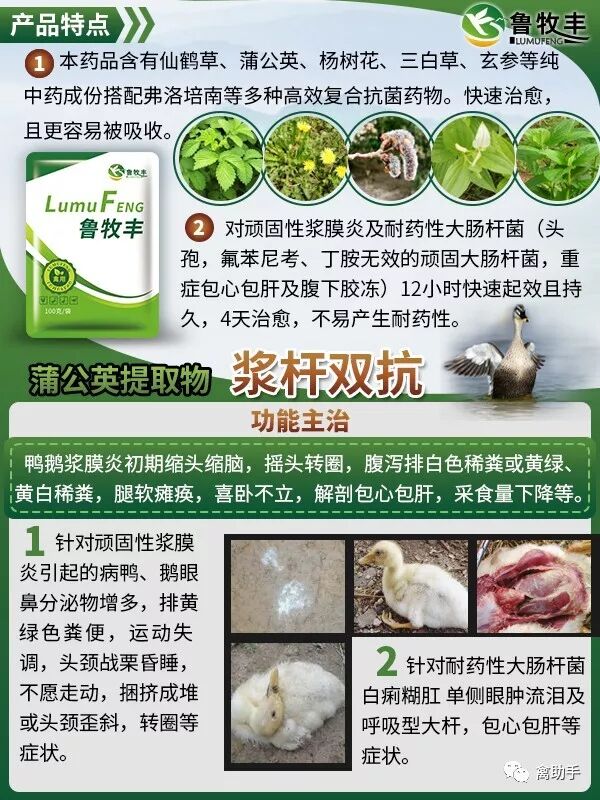 主治:鸭鹅浆膜炎初期缩头缩脑,摇头转圈,腹泻排白色稀粪或黄绿、黄白稀粪,腿软瘫痪,喜卧不立,解剖包心包肝,采食量下降等情况。