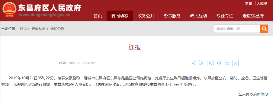 聊城市东昌府区政府新闻办公室通报,21日5时22分,接群众报警,聊城市东昌府区东昌东路鑫亚公司临街楼一餐厅发生煤气罐泄漏爆炸。东昌府区公安、消防、应急、卫生等相关部门迅速到达现场进行救援,事故造成6名人员受伤,已送往医院救治,现场排查救援和事故调查工作正在同步进行。