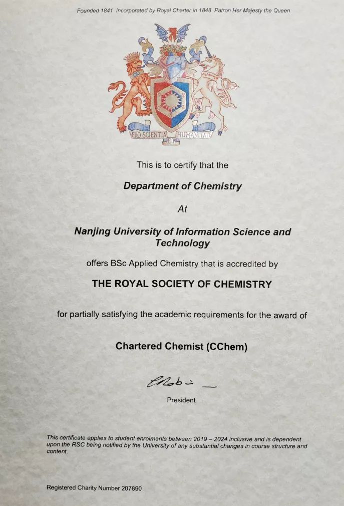 近日,南京信息工程大学在 70 年国庆前收到了一份特殊的礼物,英国皇家化学会首席执行官 Robert Parker 博士致信祝贺该校应用化学专业顺利通过英国皇家化学会认证评定委员会 (Royal Society of Chemistry Committee for Accreditation and Validation) 评估,成为我国双一流高校中第一个通过该认证的中外合作办学项目,标志着该校国际化办学取得重大进展,办学理念和成果得到国际同行一致认可。