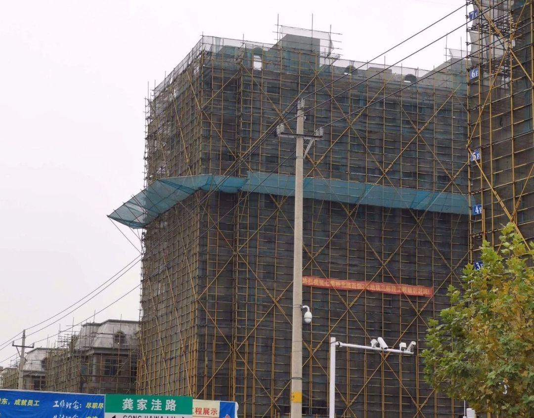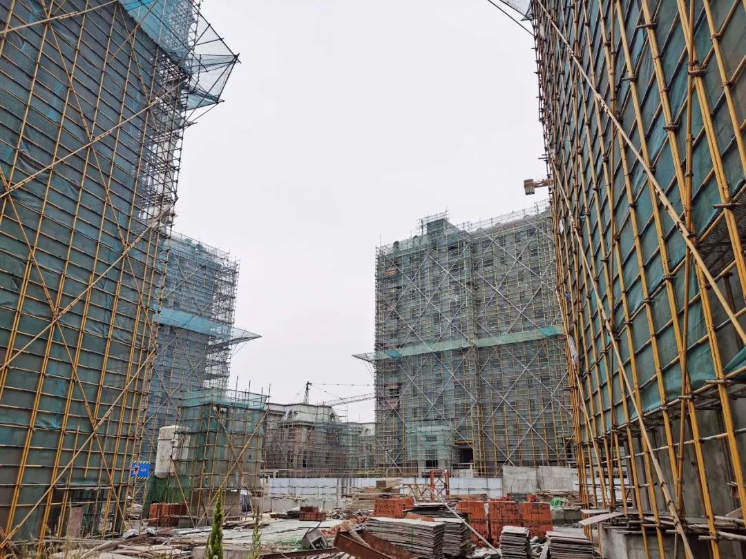 可以看到,项目的整体框架已搭建完成,走进可以看见绿网内还是红色的砖墙体,外立面尚未做好。