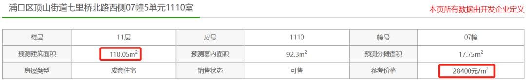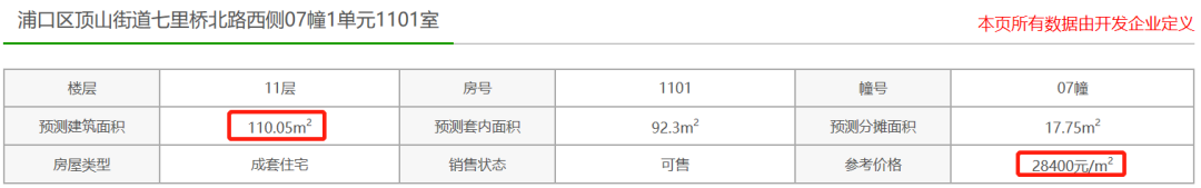 总价最高的房源是7号楼1101、1110室,单价28400元/m?,面积110.05m?,总价312.5万!