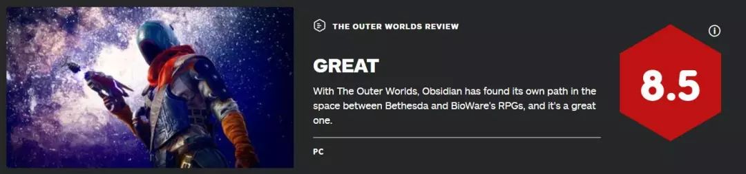其中 IGN 给出了 8.5 分,评测的编辑认为,开发商黑曜石在 Bethesda 和 BioWare 的 RPG 类型中走出了属于自己的道路,并且做得相当出色。