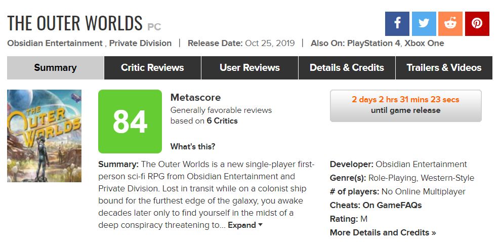 天外世界》全球媒体评分解禁,目前 Metacritic 共 7 家媒体给出了分数,平均分为 84 分。