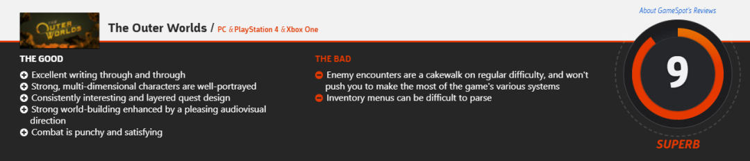 GameSpot 则在满分 10 分的情况下给出了 9 分,认为这款游戏有着无与伦比的剧情、鲜明多面的角色、有趣的任务设计以及打击感爽快的战斗,但缺点在于常规难度下敌人过于简单,且物品菜单不易使用。