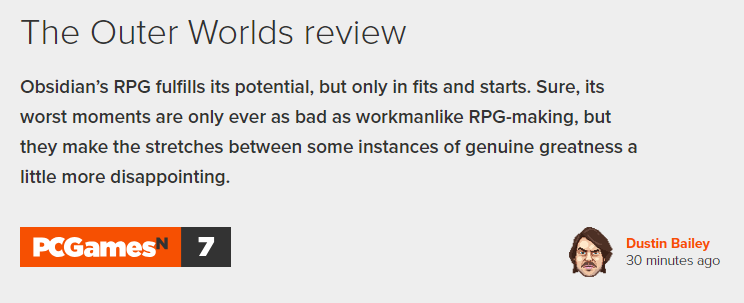 PCgamesN 则给出了 7 分,认为黑曜石的这款 RPG 作品虽发挥出了潜力,但表现时好时坏,有时暴露出精致却缺乏新意的一面,让人在觉得这游戏很棒与些许失望之间摇摆不定。