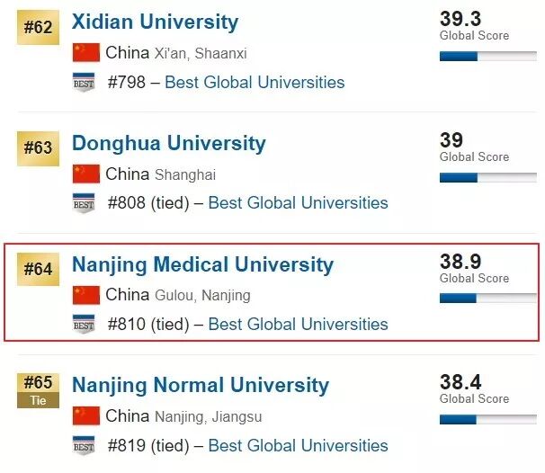 近日,U.S.News 2020世界大学排行榜正式发布。全球共有1500所高校入围,我校第五次入围,世界排名第810位。中国内地共有188所高校入围,我校排名第64位,在江苏省上榜高校中排名第11位,在全国独立设置的医学院校中位居第1名。