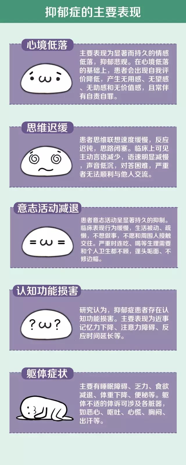1.情绪低落,高兴不起来。2.对日常生活丧失兴趣,无愉快感。3.精力明显减退,无原因的持续疲乏感。4.注意力记忆力下降。5.自我评价过低,或自责,或有内疚感,对未来充满悲观失望。6.思维缓慢,反应迟钝,或者是联想困难,或自觉思考能力显著下降。7.反复出现想死念头,或有自杀行为。8.失眠,或早醒,或睡眠过多。9.食欲问题,比如食欲不振,体重明显减轻,或有伴随有贪食。10.欲望或动力明显减退。