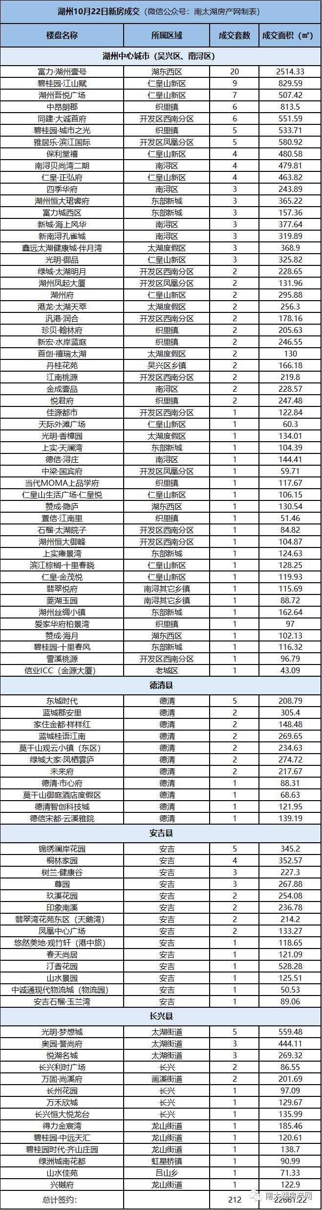 湖州10月22日新房成交212套