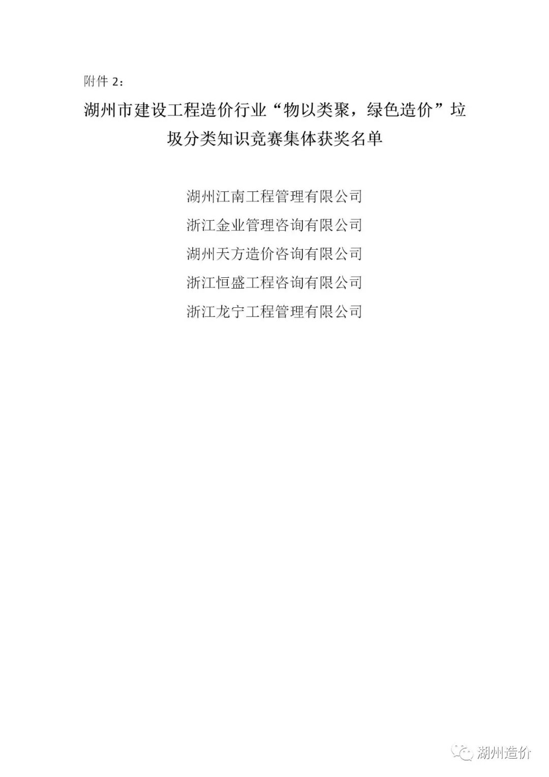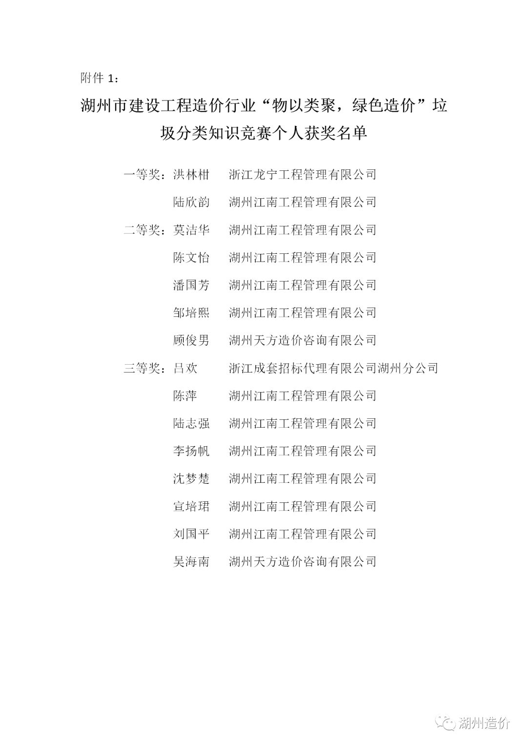 关于公布湖州市建设工程造价行业“物以类聚,绿色造价”垃圾分类知识竞赛获奖名单的通知