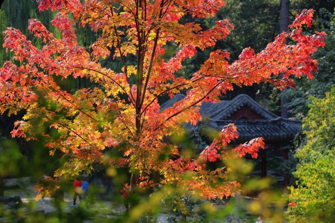 近日,北京香山公园元宝枫叶色彩斑斓惹人醉。