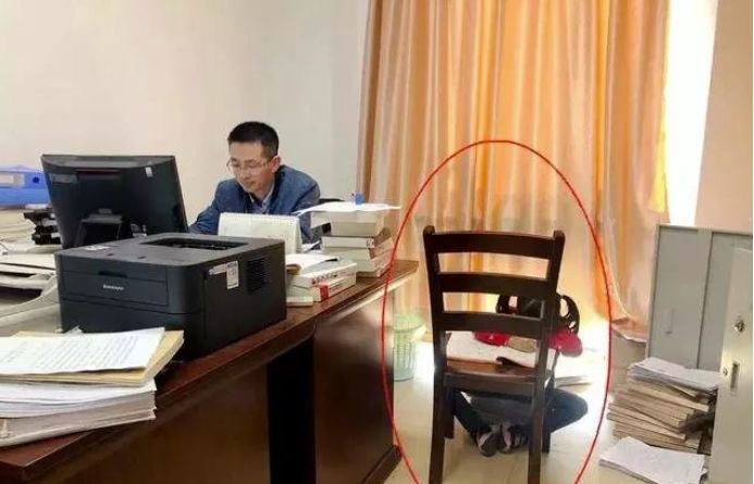 江苏法官吴俊猛在单位加班写法律文书,趴在椅子上写作业的,是他的女儿婧婧。吴俊猛法官作为骨干,加班加点是一种生活常态。