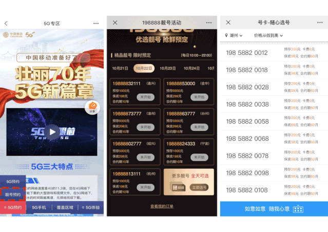 “靓号预约”点击“更多靓号”,选择地区“湖州”,即可选择198588号段的5G靓号