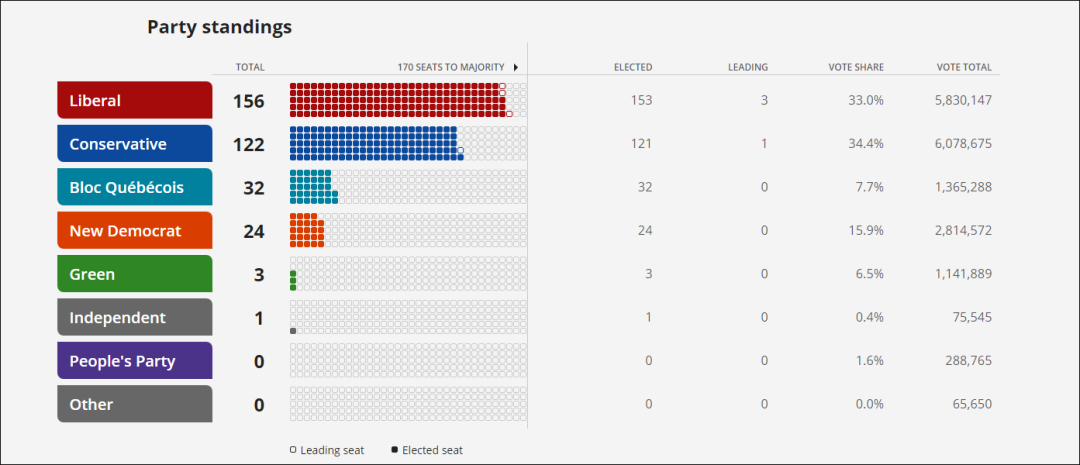 5、初步投票结果显示,加拿大现任总理特鲁多率领下的自由党拿下156个席位,领先于保守党的122个席位,成功赢得第二任期。