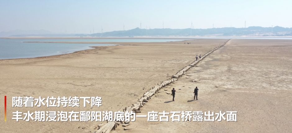 3、近日,随着水位持续下降,丰水期浸泡在鄱阳湖底的一座总长2930米、被誉为“中国最长的湖中古石桥”露出水面。