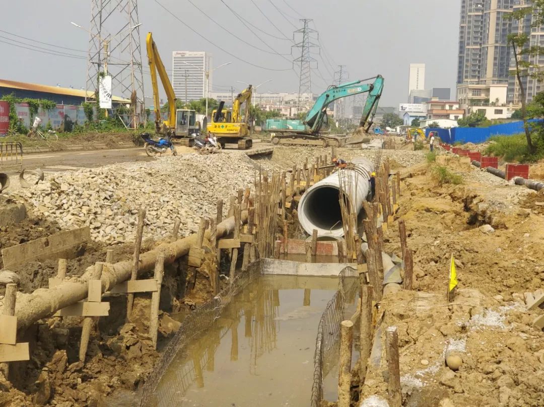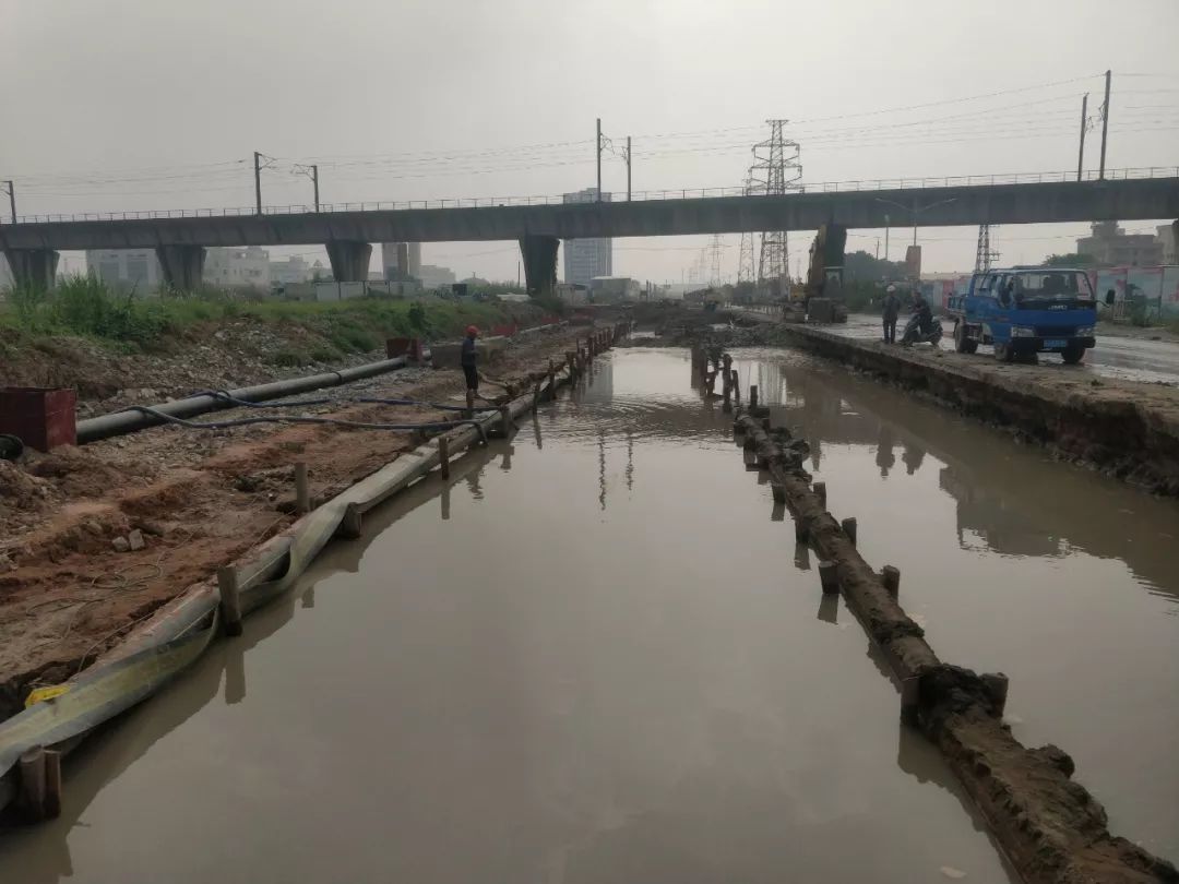 记者在相隔不远的连海路施工工地看到,因为水管下沉断裂导致自来水渗漏,施工现场变成一片“鱼塘”,建筑工人在旁边准备好了两个抽水机,马力全开抽走渗漏的自来水,好让供水公司抢修人员可以尽快维修。
