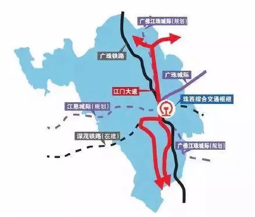 建设中的珠西枢纽江门站将是省内仅次于广州南站、深圳北站、佛山西站的第四大轨道交通枢纽。江门站建成后,向北直达广佛核心地带,向南通珠海、澳门,往东到深圳、厦门、上海,向西至贵州、广西、海南,四通八达的轨道交通路网将使江门站成为真正的珠江西岸综合交通枢纽,发挥珠三角辐射粤西乃至大西南交通门户的重要功能。