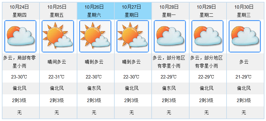 今天,多云,午后局部有零星小雨,气温22到30度。早晚体感稍凉,注意预防感冒。预计未来一周以多云到晴天气为主,部分时间有零星小雨;气温较平稳,早晚清凉。近期久晴少雨,空气干燥,请注意各项用火安全。