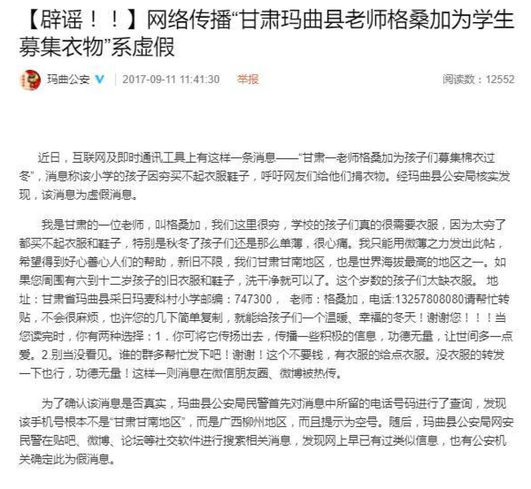 玛曲县委宣传部一位工作人员告诉记者,两年前该消息在互联网上传播时,很多爱心人士信以为真,通过邮局向玛曲县寄了很多衣物。由于信息不准确,邮局工作人员不知该如何投递,于是向当地政府报告。接到消息后,玛曲县公安局、教育科技局等多部门展开了调查。