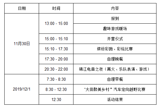 活动时间:2019年11月30日-12月1日(签到时间:11月30日 下午12点-1点 )