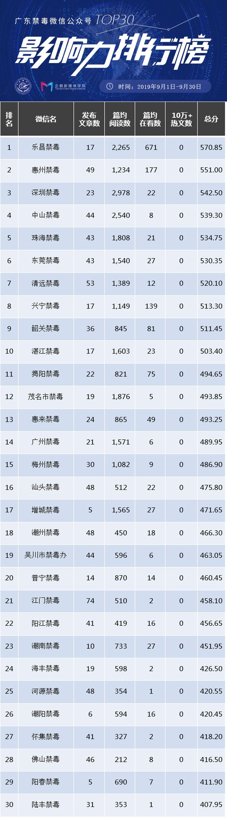本排行榜由企鹅新媒体学院和中山大学互联网与治理研究中心联合发布,盘点2019年9月广东省政务微信禁毒号排行并作出运营评价。数据由企鹅新媒体学院采集,时间自2019年9月1日至9月30日。其中,影响力总分为中山大学互联网与治理研究中心通过公式算出,公式附于文章之末。