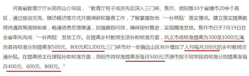 河南出台“一补两贴”政策,从今年7月1日起,按乡镇、村、教学点分别提高到每月200元、300元和500元,国家集中连片特困地区教学点最高每月补贴800元;实行中小学班主任津贴,每人每月不低于400元等。发放教师教龄津贴,按每多1年增加10元的标准累计。