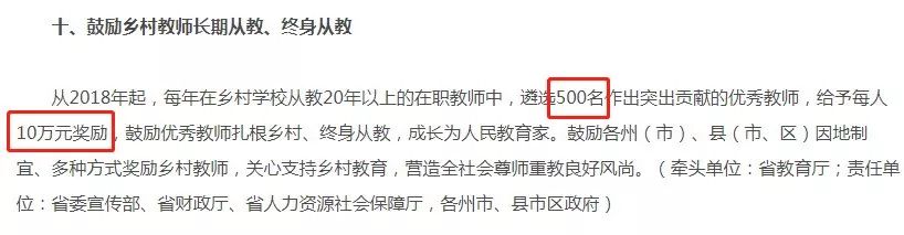 从2018年起,每年在乡村学校从教20年以上的在职教师中,遴选500名作出突出贡献的优秀教师,给予每人10万元奖励,鼓励优秀教师扎根乡村、终身从教,成长为人民教育家。