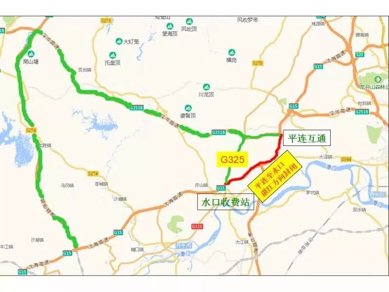 路线二 沿佛开、江鹤高速往开平方向车辆绕行线路:平连互通→江罗高速→古猛收费站→325国道→水口收费站→沈海高速开阳段。