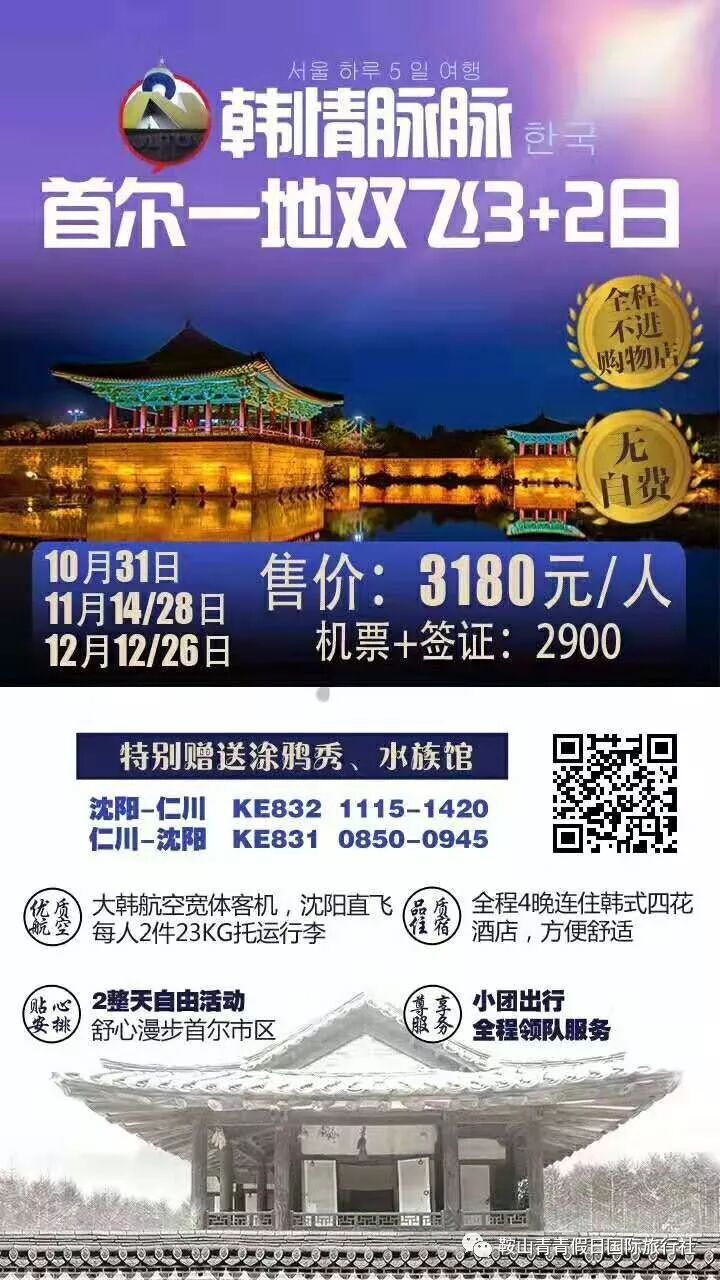 鞍山起止 11月14/28日 首尔一地3+2日游 3180元
