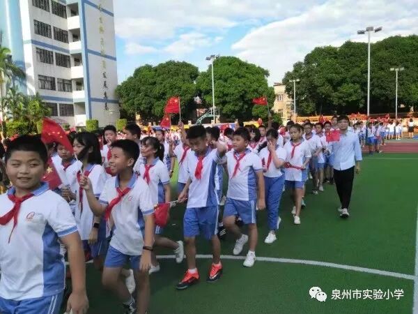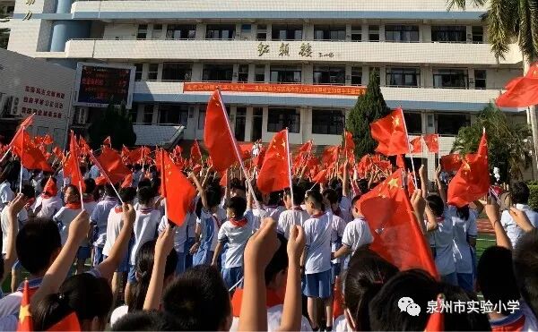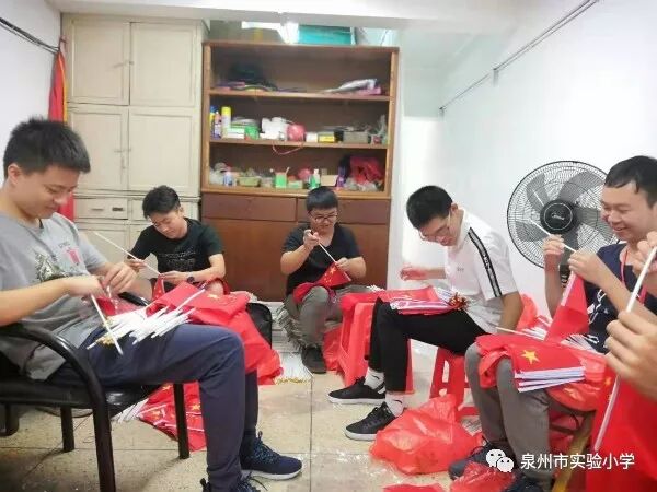79月29日下午,福师大跟岗实习队参与到泉州实小庆祝中华人民共和国成立70周年主题活动中。他们先是帮忙制作供活动所需的小红旗2000多面,接着参与到活动的秩序引导、班级带队中去。