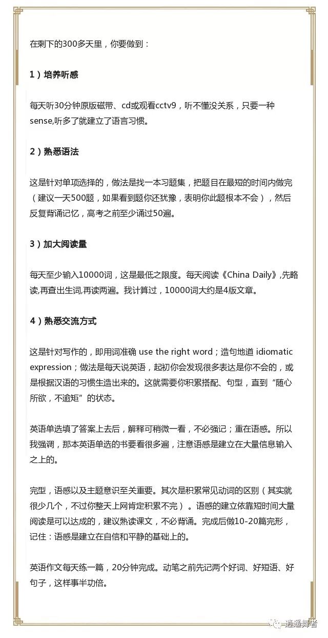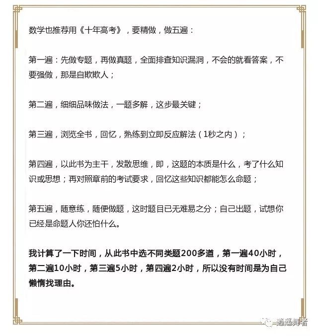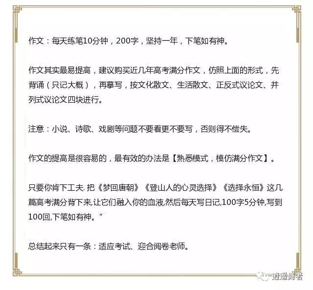 但是,当你拿到清华或北大的通知书时,你才知道,自己的努力最终会获得回报。高考状元智商是要比常人高一些,但是他们之所以会成为状元,靠得一定是“自信”而不是其他!他们有计划,有目标,有决心的在前进,并且告诉自己,别回头,我只能成功。在高三努力拼命的学子大有人在,但真正喜获丰收的却不多,究其因,其实是方法不对。今天我就把我的这位学生高三的学习经验整理一番,给大家分享出来。如果你的孩子也即将步入高三,那么不妨花几分钟时间看看这篇文章,也许这正是你孩子需要的东西。