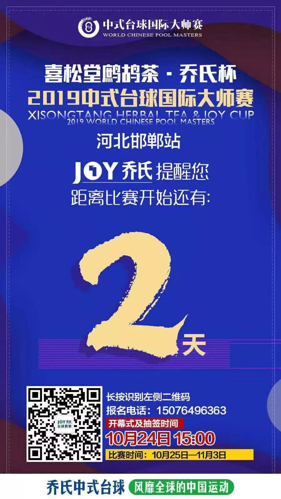 10月24日,喜松堂鹧鸪茶·乔氏杯2019中式台球国际大师赛河北邯郸站即将盛大开幕,本年度最后一站大师赛,报名格外踊跃。目前距离报名截止仅剩2天,“邯郸12时辰”紧张时刻,冲击15万的最后机会,赶紧报名吧!
