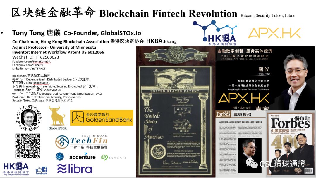 據悉,2019年10月22日中國上海,環球證券通證有限公司(GlobalSTOX Limited)總裁、香港區塊鏈協會(Hong Kong Blockchain Association)聯合會長Tony Tong唐儀,受邀出席由上海財經大學金融學院指導,泛長三角交易銀行暨產業鏈金融研究院主辦的“區塊鏈科技創新與發展論壇”,並做了主題演講:區塊鏈金融革命 Blockchain Fintech Revolution。出席本次會議的重要嘉賓還有:
