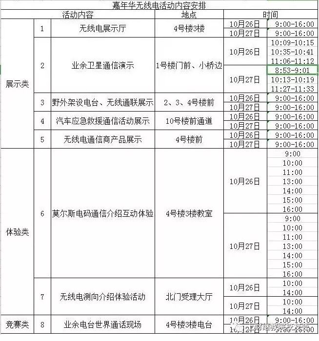 “科技体育嘉年华”的无线电板块活动内容包含:参观无线电展示厅,业余卫星通讯,野外电台架设,汽车应急救援通讯,摩尔斯电码收发报,无线电测向,业余电台世界通话等七大板块。