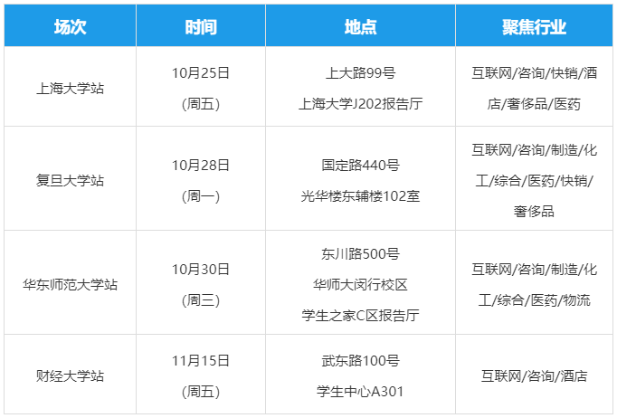 2019年度 “大学生职场能量训练营”的合作高校为复旦大学、华东师范大学、上海财经大学、上海大学等4所高校,在接下来的三周内,训练营的导师们将分别走进这四个大学校园,与青年求职者来一场面对面的“亲密接触”。来吧,准备好你们的问题、简历,以及一颗“跃跃欲试”的求职心,线上线下,我们等你!