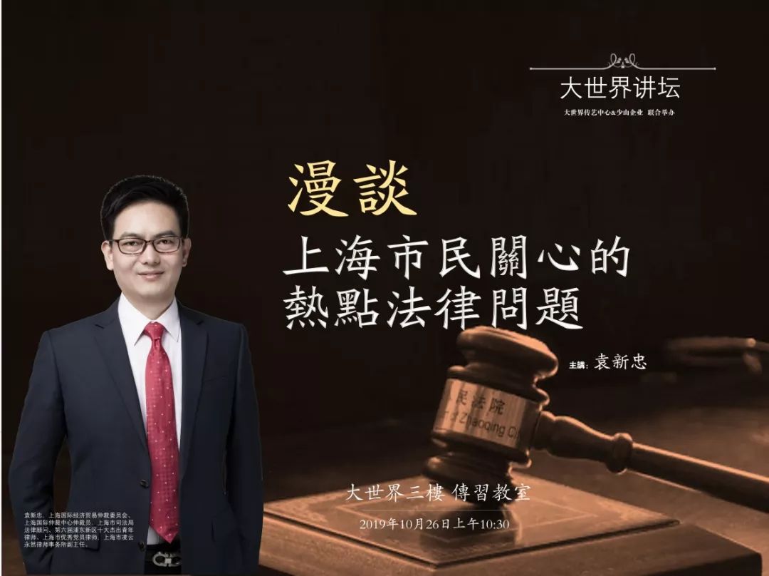 活动名称:大世界讲坛:漫谈上海市民关心的热点法律问题活动名称:2019年10月26日 10:15-12:00活动地点:上海大世界 三楼传习教室参与方式:点击阅读原文,明天中午12点开始预订