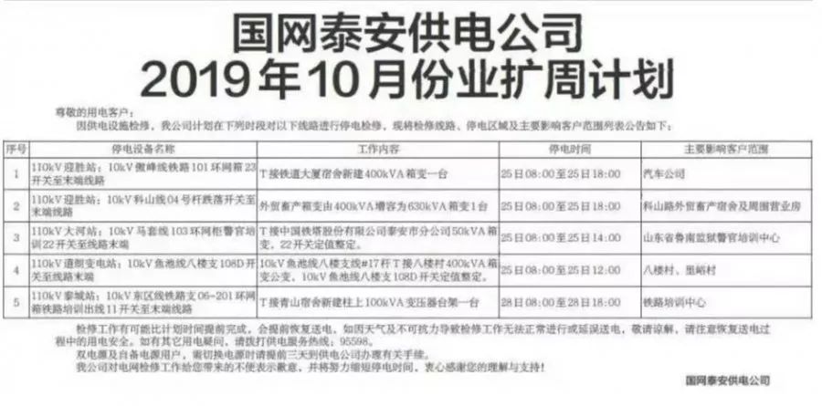 因供电设施检修,国网泰安供电公司计划在下列时段对以下线路进行停电检修,现将检修线路、停电区域及主要影响客户范围列表公告如下: