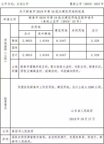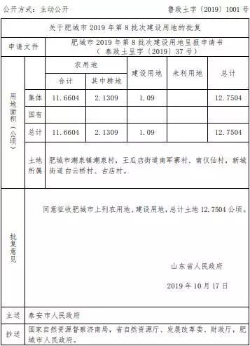 土地所属:肥城市潮泉镇潮泉村,王瓜店街道南军寨村、南仪仙村,新城街道白云桥村、古店村。批复意见:同意征收肥城市上列农用地、建设用地,总计土地12.7504公顷。泰安市新泰市2019年第10批次建设用地